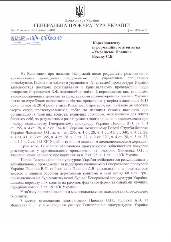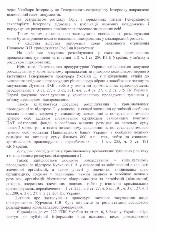 Генеральная прокуратура приостановила расследование уголовных производств в отношении бывшего генерального прокурора Виктора Пшонки, бывшего первого замгенпрокурора Рената Кузьмина, экс-главы Службы безопасности Украины Александра Якименко, а также против бывшего главы Национального банка Украины Игоря Соркина.