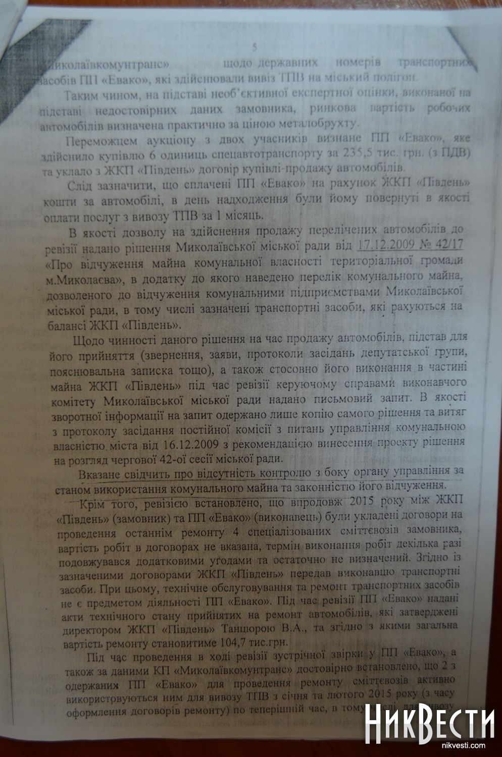 Также в документе говорится о том, что ЖКП «Південь» продало ЧП «Евако» продало 6 мусоровозов за 178,5 тысяч гривен. При этом в экспертном отчете рыночная стоимость аналогичных автомобилей, бывших в пользовании, составляет 517 тысяч гривен.