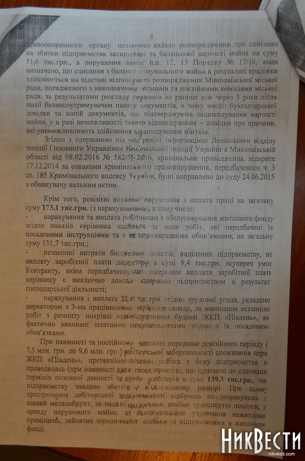 Ранее сообщалось, что по результатам ревизии финансово-хозяйственной деятельности жилищно-коммунального предприятия Николаевского городского совета «Південь», осуществляющего обслуживание объектов жилищного фонда в Ингульском (Ленинском) районе города, за период с 2012 по 2015 года, начато производство по 191 статье Уголоного кодекса Украины.