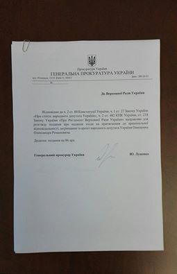 — В соответствии с частью 2 статьи 80 Конституции Украины частью 1 статьи 27 Закона Украины "О статусе народного депутата Украины", части 2 статьи 482 КПК Украины, статьи 218 Закона Украины "О регламенте Верховной рады Украины" направляю для рассмотрения представление о согласии на привлечение к уголовной ответственности, задержания и ареста народного депутата Украины Онищенка Александра Романовича, - говорится в документе.