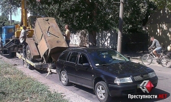 В среду, 20 июля, в Николаеве на улице Спортивная дизельный генератор, который перевозили на специальной платформе, по неизвестным причинам скотился на асфальт и повредил легковушку «ŠKODA Octavia».