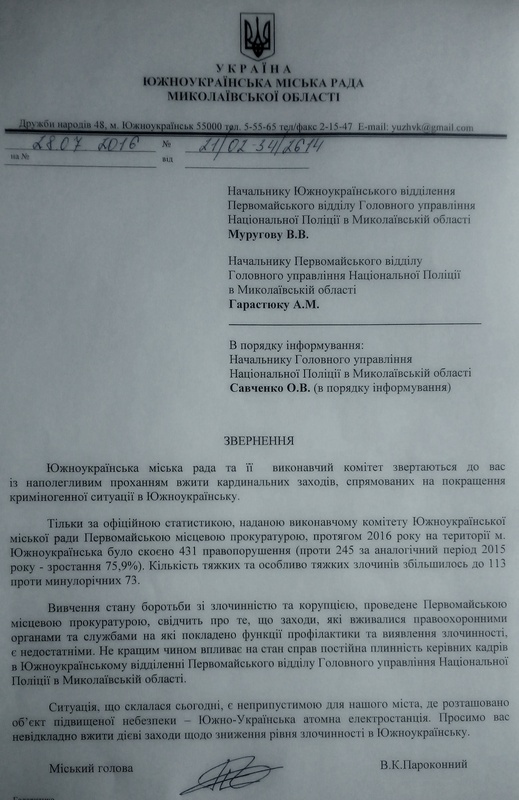 – Ситуация, которая сложилась сегодня, является недопустимой для нашего города, в котором размещён объект повышенной опасности – Южно-Украинская АЭС. Просим Вас неотложно принять действенные меры по снижению уровня преступности в Южноукраинске, – отмечается в обращении Южноукраинского городского совета к руководству Национальной полиции.