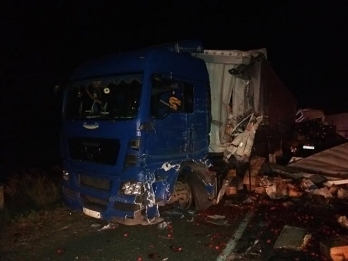 В результате столкновения большегрузов один из водителей оказался заблокированным конструктивными элементами грузовика.