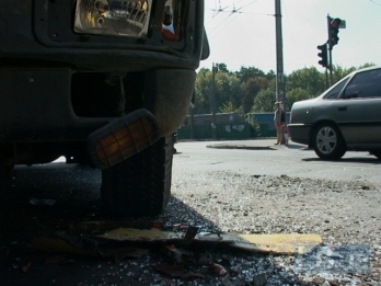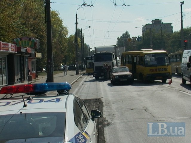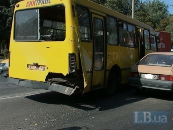 Во вторник в Киеве на улице Маршала Гречко грузовик МАЗ протаранил маршрутный автобус "Богдан" с пассажирами.