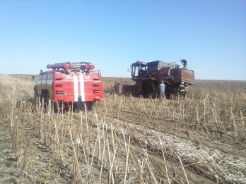 Спасатели выяснили, что комбайн загорелся на поле с подсолнечником при сборе урожая.