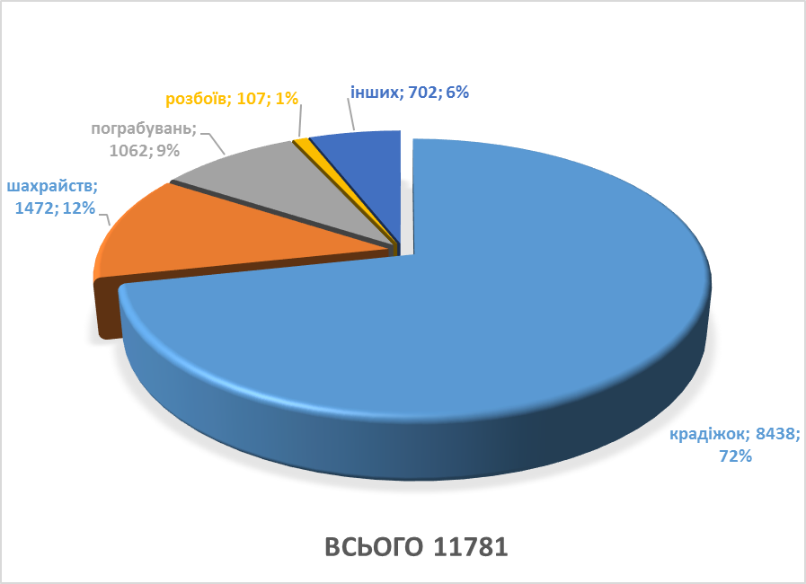Возросло число преступлений против собственности на 18,8%, из них: вымогательств на 25%, мошенничеств на 6,8%, краж на 22,3%, грабежей на 51,9%, разбоев на 1%.