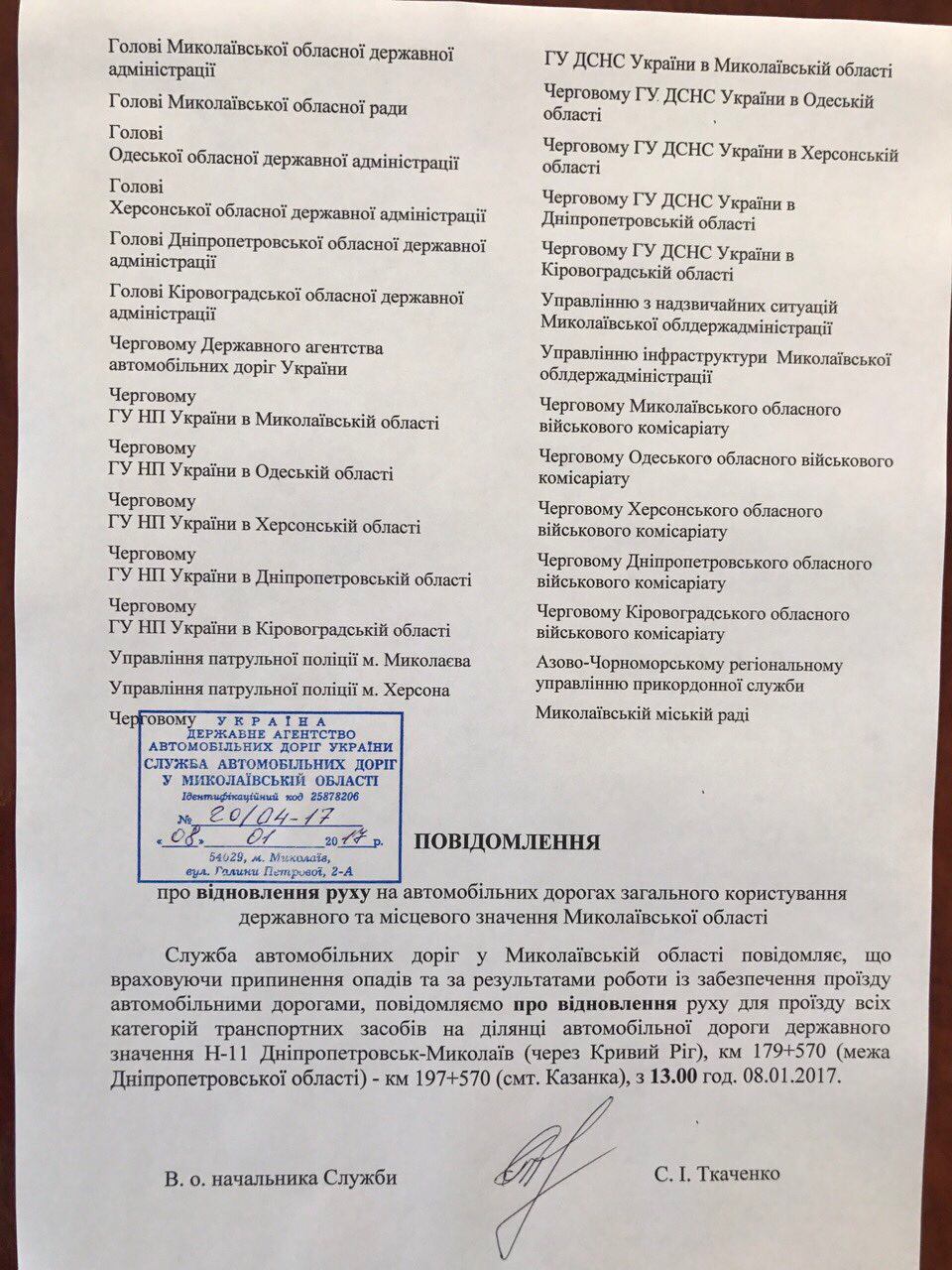 В Николаевской области с 13 часов 8 января снято временное ограничение для движения транспорта по трассе Н-11 Днепропетровск-Николаев, участок: граница Днепропетровской области - км 197 + 570 (Казанка).