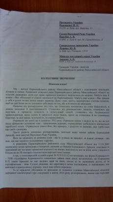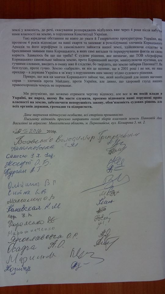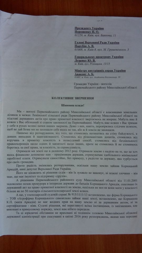 Более полутысячи пайщиков Первомайского района подписали коллективное обращение на имя Президента Украины Петра Порошенко, министра внутренних дел Арсена Авакова, главы Верховной Рады Андрея Парубия, Генерального прокурора Украины Юрия Луценко с просьбой восстановить права на их земельные наделы, захваченные предприятием народного депутата Аркадия Корнацкого «Агрофирмой Корнацкого».