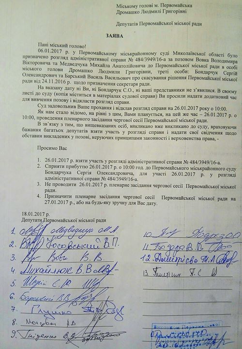 Треть депутатского корпуса Первомайского горсовета обратилась к городскому голове Людмиле Домашко с заявлением о переносе сессии, в связи с заседанием суда по иску об отмене назначения представителя фракции «Оппозиционный блок» Сергея Бондарчука секретарем горсовета. Заседание суда, как и сессия горсовета, должны состояться 26 января.