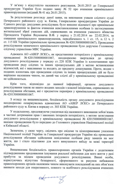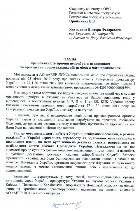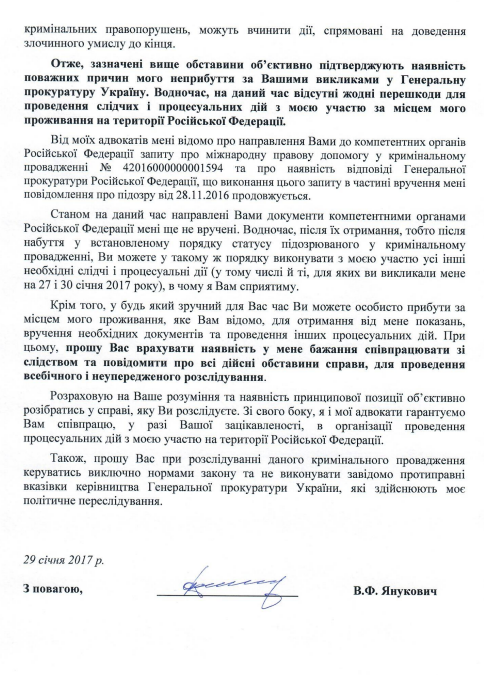 В заявлении беглого экс-президента сказано о якобы имеющемся о него желании сотрудничать со следствием и сообщить обо всех истинных обстоятельствах дела. Адвокат утверждает при этом, что Виктору Януковичу до сих пор не вручено подозрение, несмотря на заявления генпрокурора Юрия Луценко.