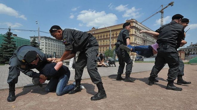 В действительности число россиян, считающих, что российские власти нарушают их право на свободу собраний, не ограничивается десятками, отмечает ВВС.