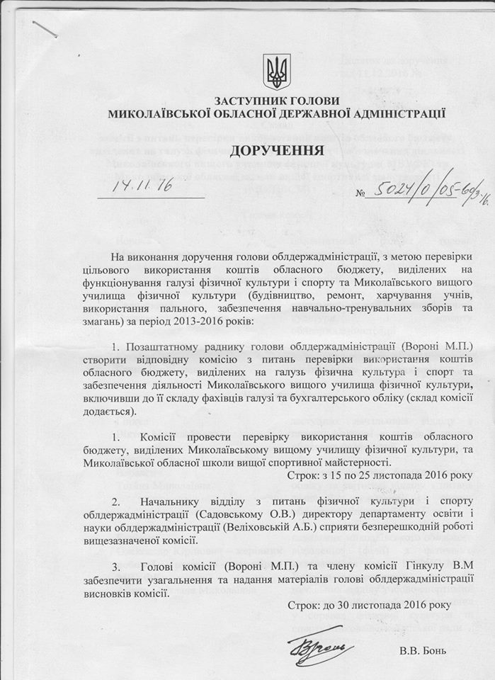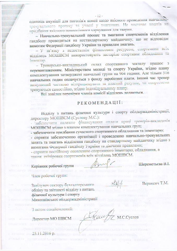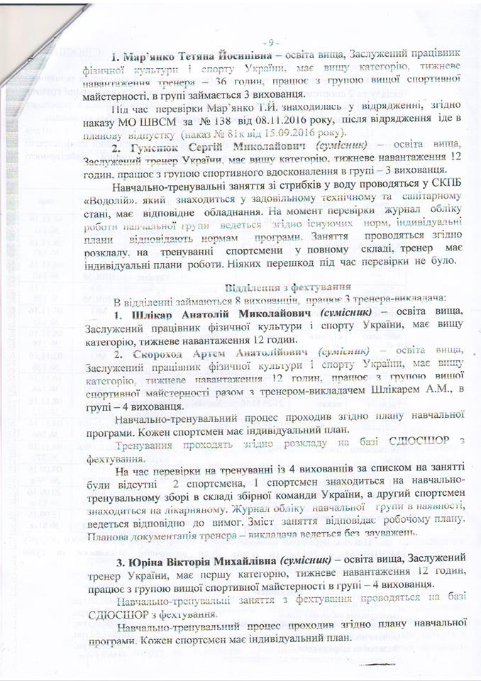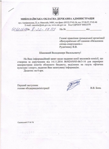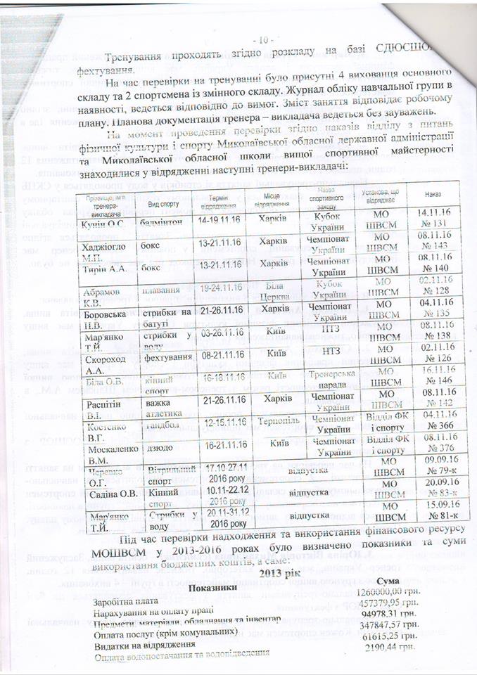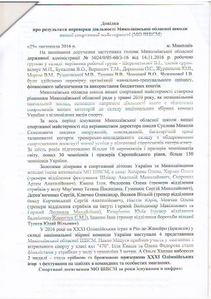 Владимир Рудниченко приводит в пример справку о результатах деятельности Николаевской областной школы высшего спортивного мастерства, которую составили после поручения Алексея Савченко проверить использование бюджетных средств, выделенных на спорт. Указывается, что реальная картина не соответствует тому, что чиновники показали в документе.