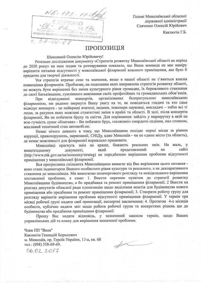 - Прошу Вас поддержать требования к областной власти - губернатору и депутатам по приобретению или строительству нового помещения для Николаевской областной филармонии. К сожалению в концепции развития области до 2020 года не предусмотрено решения проблемы бездомной филармонии. Это позор для всей области. Мы убеждены что без культурного и духовного возрождения не возможно возрождение экономическое. Можно до бесконечности бороться с коррупционерами но пока не восстановлен культурный код, и делать зло понимая все последствия этого действия допустимо и одобряется в обществе - мы не добьемся успеха, - написал Виктор Каклюгин, призвав николаевцев поддержать помещение.