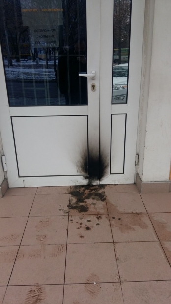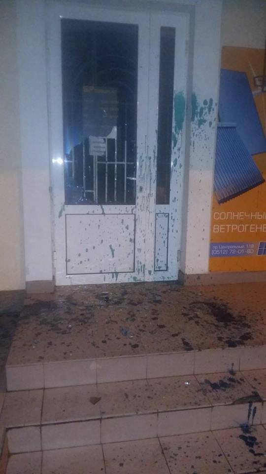 Вчера вечером, 18 февраля, неизвестные разбили стекло и облили зеленкой дверь в офисном здании по проспекту Центральному, принадлежащему представителю «Украинского выбора», депутату Николаевского областного совета Максиму Невенчанному.