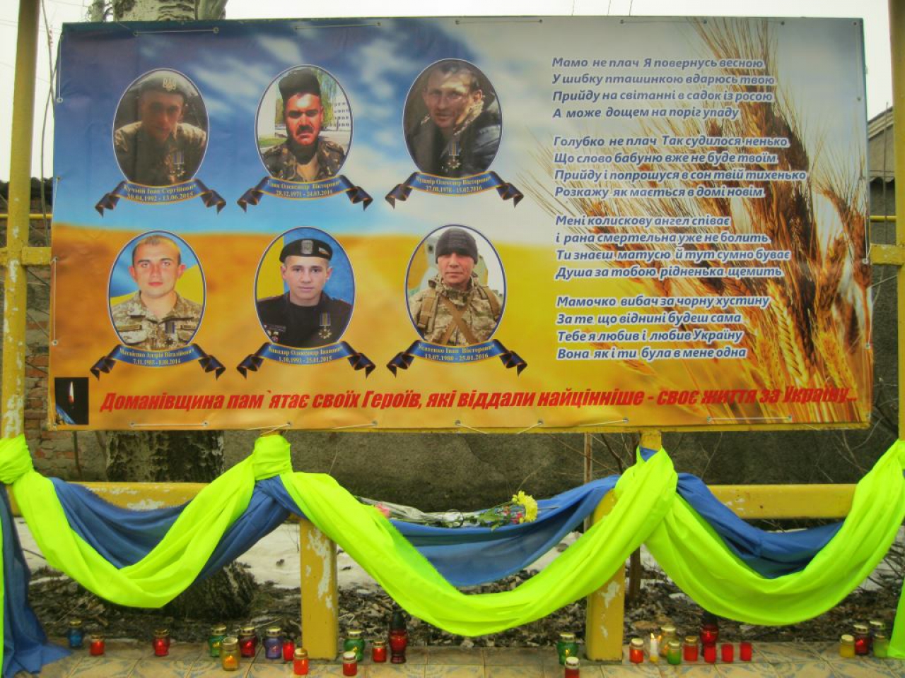 На Стене памяти изображены шесть молодых юношей, которые отдали свою жизнь, выполняя воинский долг. Андрей Матвиенко из Кузнецового, Александр Ливадар и Иван Усатенко из Доманевки, Иван Кучмий из Богдановки, Александр Кушнир и Александр Един из Козубовки.