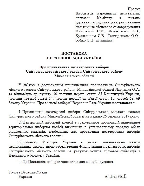 Во вторник, 21 февраля, в ходе заседания Верховной Рады Украины депутаты проголосовали за назначение внеочередных выборов городского головы Снигиревки на 30 апреля 2017 года.