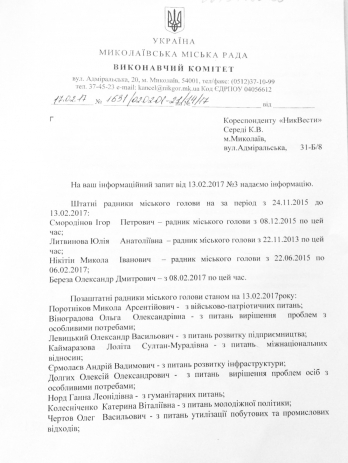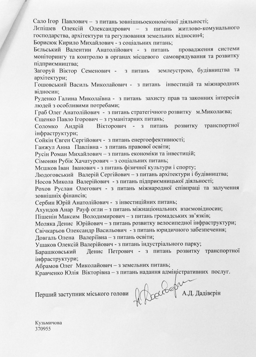 Состоянием на 13 февраля, штатными советниками мэра Николаева являются Игорь Смородинов, Юлия Литвинова и Александр Береза. Внештатными советниками Александра Сенкевича являются: Николай Поротников, Ольга Виноградова, Александр Левицкий, Лолита Каймаразова, Андрей Ермолаев, Алексей Долгих, Анна Норд, Катерина Колесниченко, Олег Чертов, Игорь Сало, Алексей Лепишев, Кирилл Борисюк, Валентин Бельский, Виктор Загоруй, Василий Гошовский, Галина Руденко, Олег Граб, Павел Ещенко, Андрей Соломко, Евгений Сойкин, Анна Ганжул, Роман Русин, Рубик Симоняк, Иван Мешков, Валерий Людоговский, Николай Носов, Руслан Рохов, Юрий Сербин, Анар Ахундов, Максим Пишенин, Денис Моляка, Александр Свечкарев, Елена Довгань, Алексей Ушаков, Денис Барашковский, Олег Абрамов и Юлия Кравченко.