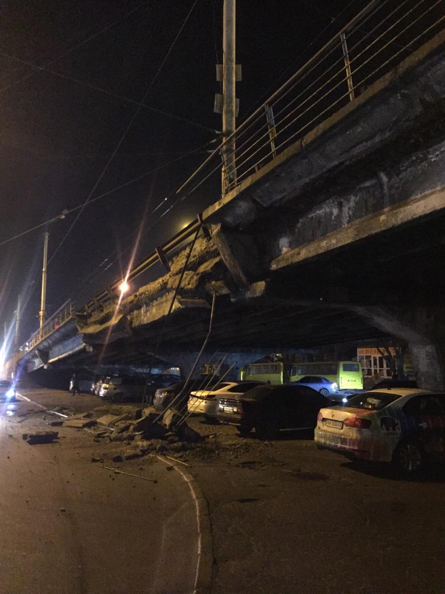 Напомним, в понедельник обрушилась пешеходная часть консоли Шулявского путепровода. Проезд общественного транспорта на мосту сейчас ограничен.