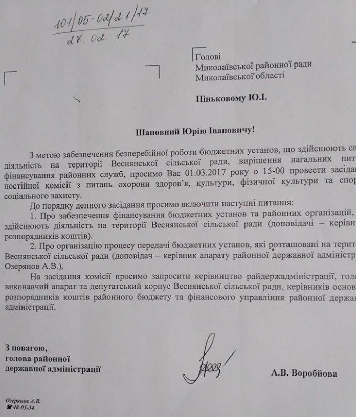Глава Николаевской районной государственной администрации Алла Воробьева обратилась письмом к главе Николаевского районного совета Юрию Пиньковому, чтоб депутаты рассмотрели вопрос финансирования бюджетных учреждений на территории Веснянского сельского совета.