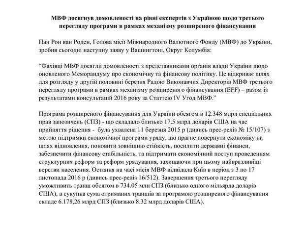 — Специалисты МВФ достигли договоренности с представителями органов власти Украины относительно обновленного меморандума об экономической и финансовой политике. Это открывает путь для рассмотрения во второй половине марта советом исполнительных директоров МВФ третьего пересмотра программы в рамках механизма расширенного финансирования (EFF) – вместе с результатам консультаций 2016 года по Статье IV Соглашений МВФ, - цитирует издание заявление МВФ.