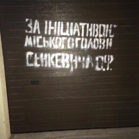Ранее надпись «За ініціативи міського голови Сєнкевича О.Ф.» появилась на заброшенном здании общежития по проспекту Мира, 16-Б. Спустя несколько часов ее закрасили.
