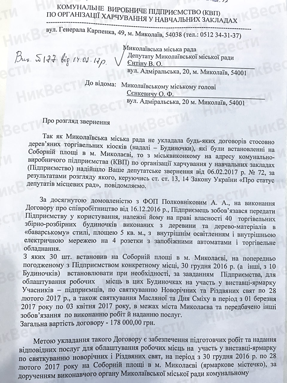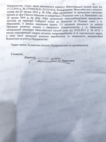 Сообщается, что эта работа проводилась КОПом, в соответствии с письмом исполнительного комитета Николаевского городского совета от 15 декабря 2016 года, распоряжений Николаевского городского головы от 2 декабря 2016 года №339 «Об организации и проведении праздничных мероприятий ко Дню Святого Николая, а также новогодних и Рождественских праздников в Николаеве», от 28 декабря 2016 года №365 «Об организации энергосбережения ярмарочного городка на территории Соборной площади на Новогодние и Рождественские праздники в Николаеве», в рамках выполнения пункта 3.5 направлений деятельности и мер Программы развития малого и среднего предпринимательства в Николаеве, утвержденной решением Николаевского городского совета от 23 января 2015 года №45/13 с целью популяризации товаров местных производителей и их торговых марок, в том числе продукции собственного производства и дальнейшего использования домиков на усмотрение предприятия.
