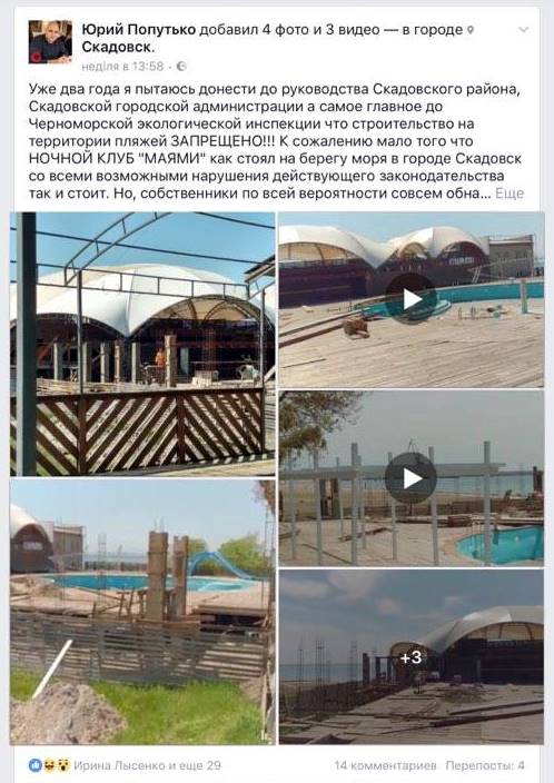 Также два года директор департамента выступает против застройки пляжей. Недавно он обнародовал факты незаконного строительства в Скадовском районе, где на территории пляжа с нарушением закона построен ночной клуб «Майами».