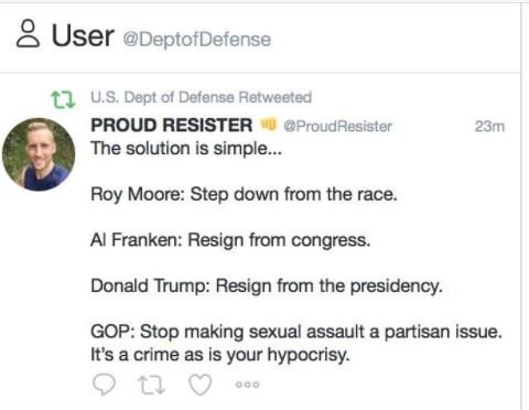 — Оператор официального аккаунта @DeptofDefense в Twitter по ошибке ретвитнул контент, который не одобрило бы Министерство обороны. Оператор заметил эту ошибку и немедленно удалил ее, - написала Дана Уайт.