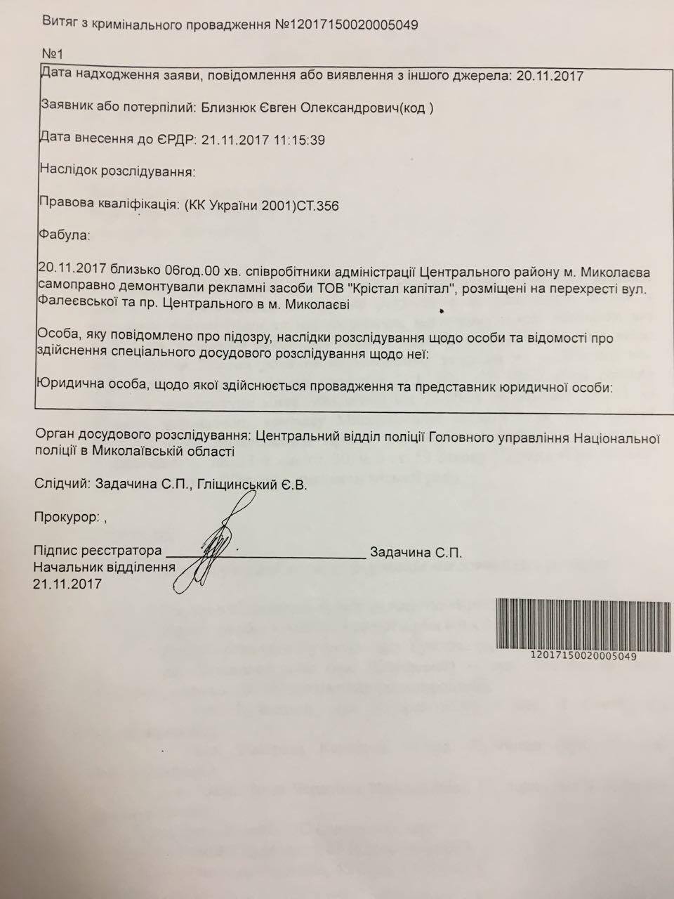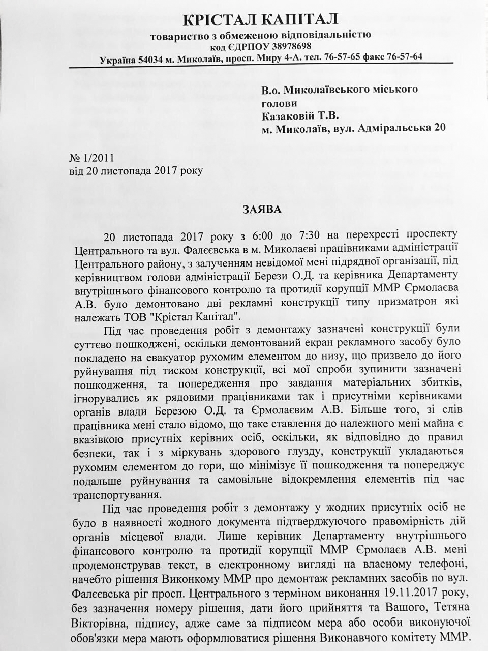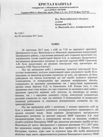 Как известно, утром 20 ноября на перекрестке проспекта Центрального и улицы Фалеевской работниками администрации Центрального района с привлечением неизвестной подрядной организации, под руководством директора Департамента внутреннего контроля Николаевского горсовета Андрея Ермолаева, были демонтированы две рекламные конструкции типа призматрон, принадлежащие ООО «Кристал Капитал».