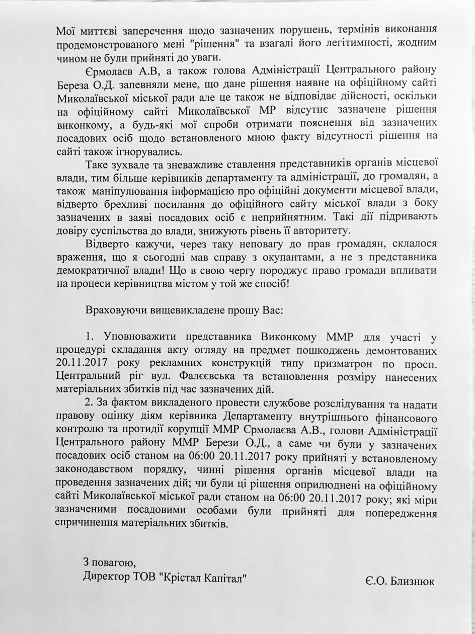 Евгений Близнюк обратился к Татьяне Казаковой с просьбой уполномочить представителя исполкома Николаевского горсовета для участия в процедуре составления акта осмотра на предмет повреждений демонтированных 20 ноября билбордов и определения размера нанесенных материальных убытков. Также предприниматель попросил провести служебное расследование и дать оценку действиям Андрея Ермолаева и Александра Березы, а также сообщить, принимались ли исполкомом решения о демонтаже билбордов на пересечении проспекта Центрального и улицы Фалеевской и были ли эти решения опубликованы на сайте Николаевского городского совета.