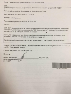 Он также сообщил, что во время проведения работ по демонтажу ни у кого из присутствовавших не было в наличии никакого документа, подтверждающего правомерность действий. По словам предпринимателя, лишь директор департамента внутреннего контроля и противодействия коррупции Андрей Ермолаев показал ему текст в электронном виде на собственном телефоне, якобы это решение исполкома Николаевского горсовета, на основании которого он действует. Однако на документе отсутствовала дата решения, его номер и подпись исполняющей обязанности мэра Татьяны Казаковой.