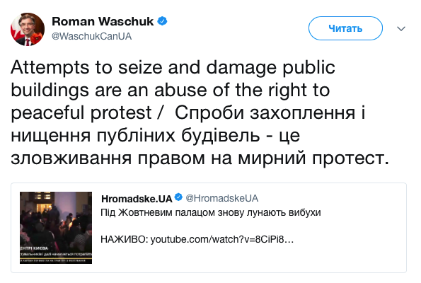 Глава канадской дипломатической миссии Роман Ващук заявил, что протестующие "злоупотребили правом на мирный протест".