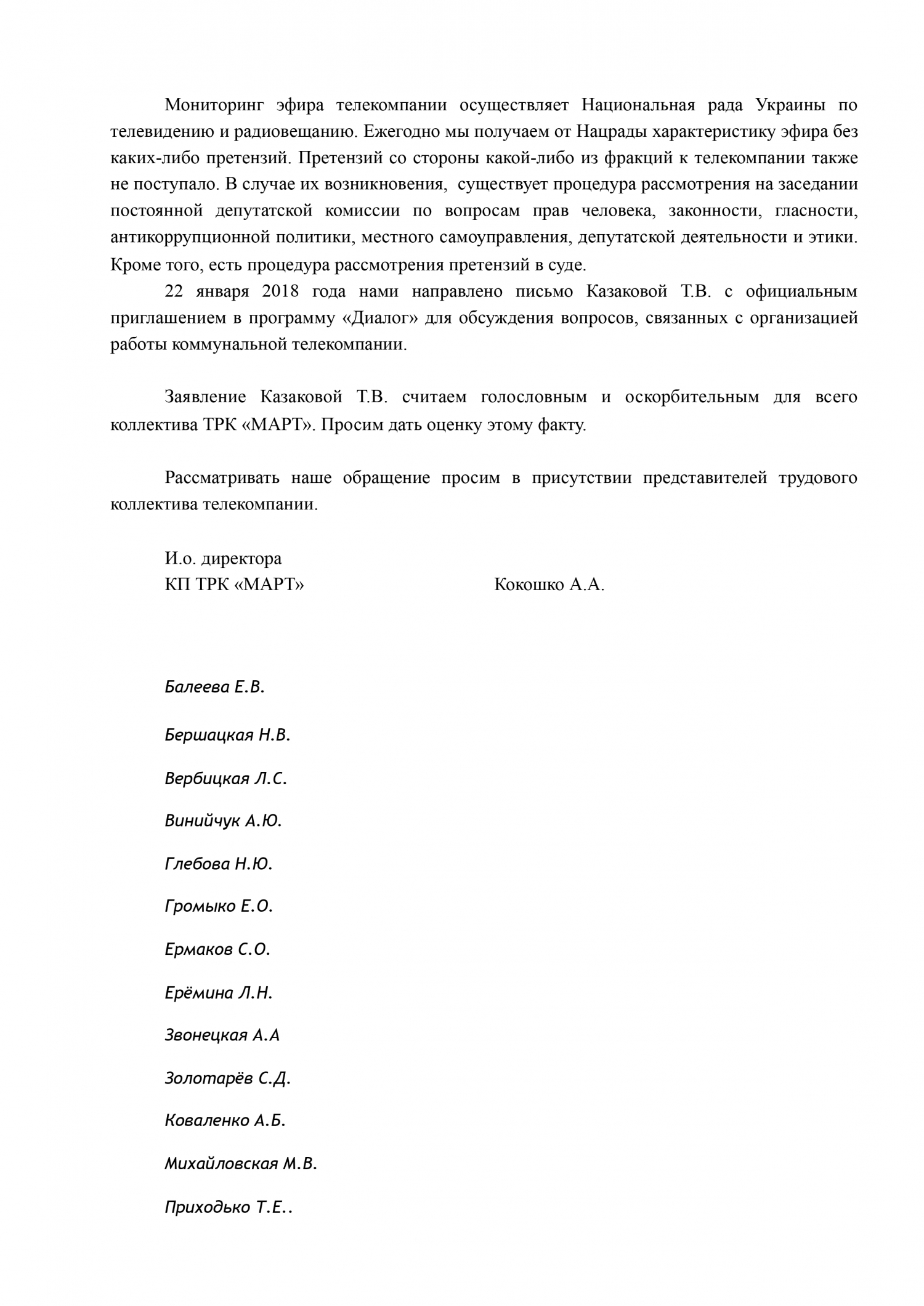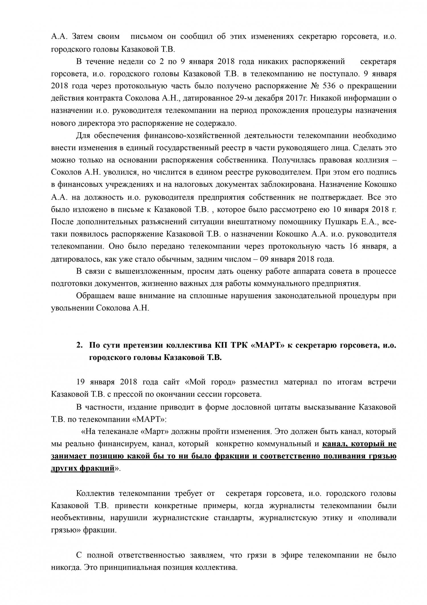 Также сотрудники телекомпании просят дать оценку словам Татьяны Казаковой, которая заявила, что «МАРТ» занял одну политическую позицию и «поливает грязью» другие фракции.