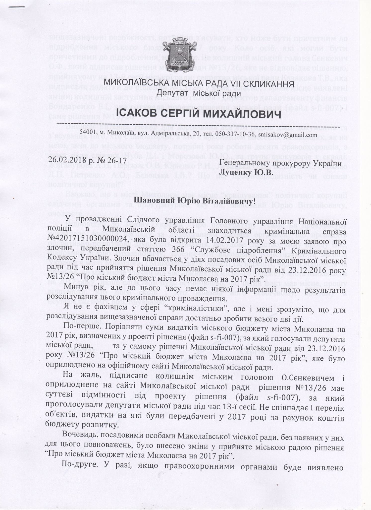 В заключение депутат просит Юрия Луценко дать, наконец, ответ на вопрос: имело ли место преступление во время принятия городского бюджета Николаева на 2017 год.