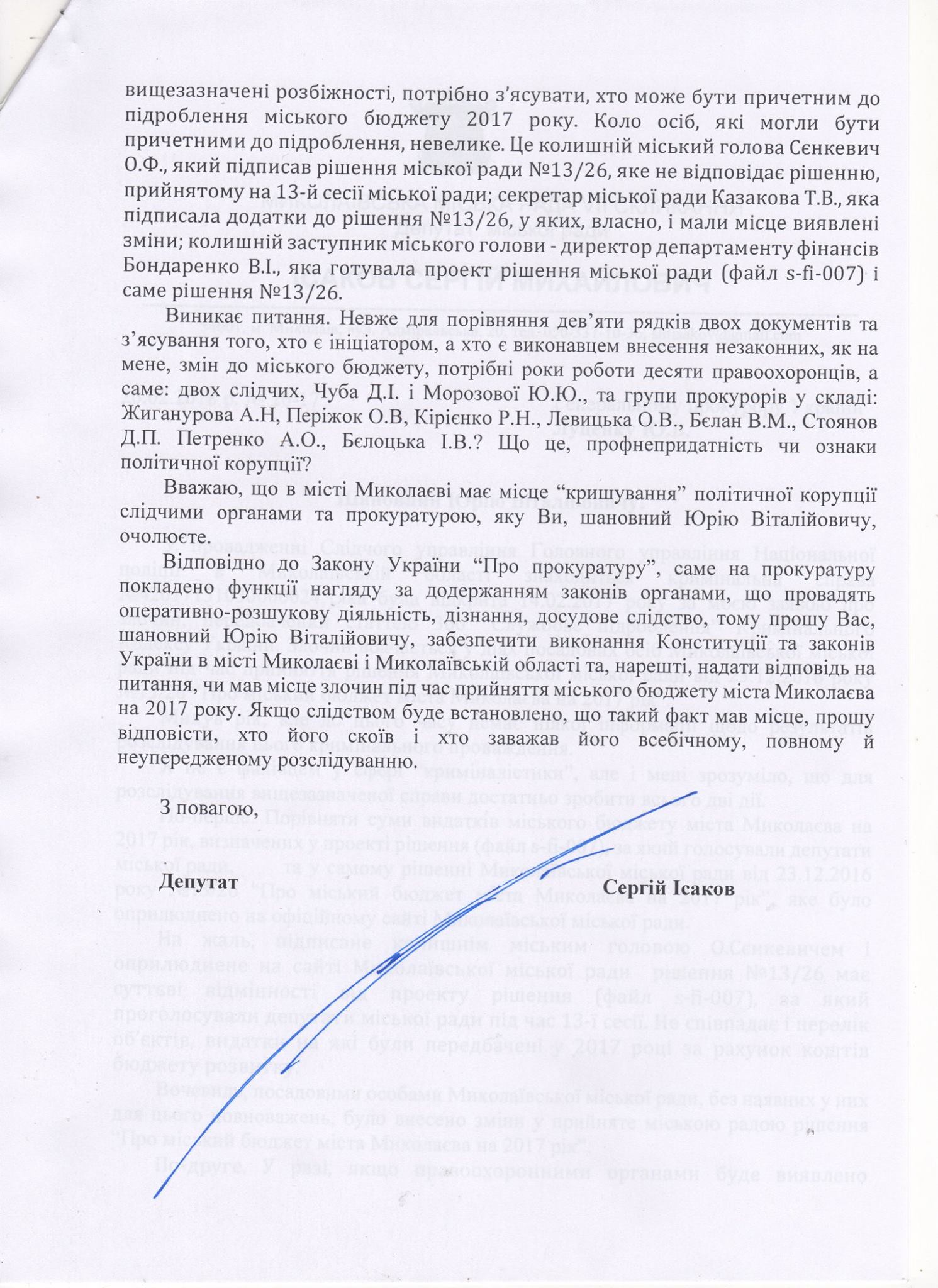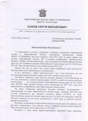 Депутат Николаевского городского совета Сергей Исаков написал письмо генеральному прокурору Юрию Луценко, в котором указал, что прошел уже год с тех пор, как он заявил о подделке решения сессии о проекте бюджета города на 2017 год, а прокуратура открыла уголовное дело.