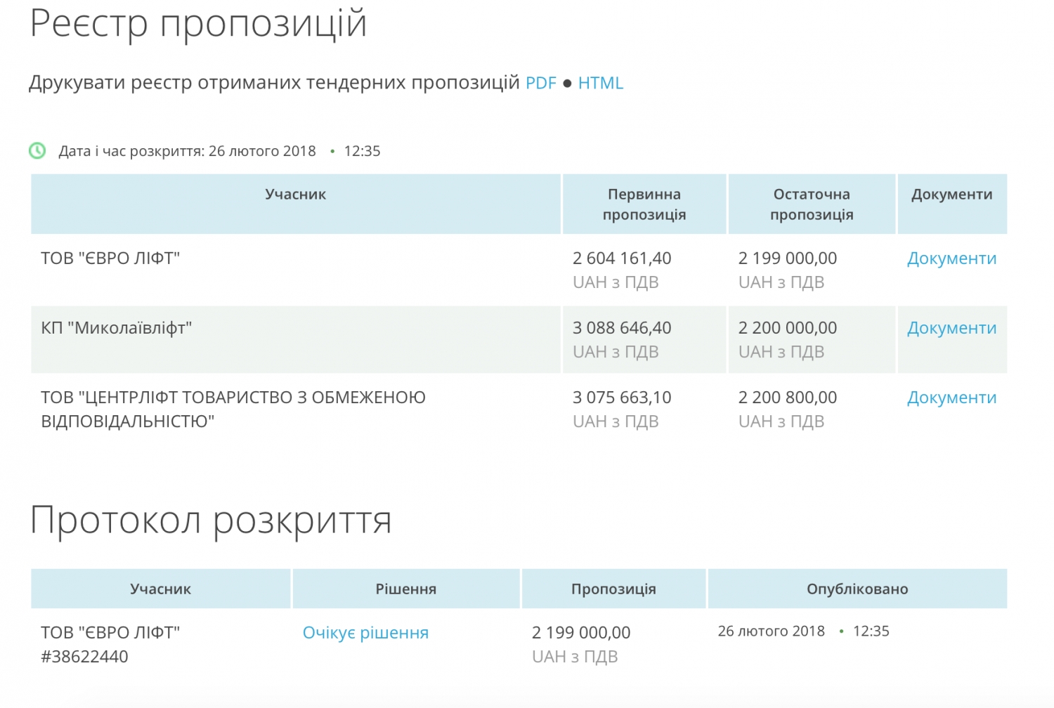 Окончательное предложение компании «Евро лифт» оказалось самым меньшим - 2 миллиона 199 тысяч гривен.