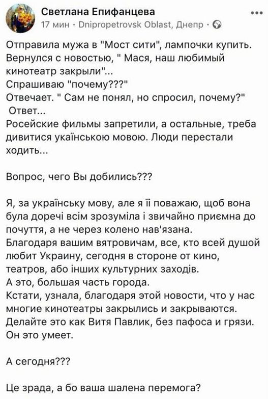 Светлана Епифанцева уже не раз попадала в различные скандалы из-за провокационных заявлений. На днях она заявила о массовом закрытии кинотеатров в Днепре, которые якобы становятся убыточными из-за показа фильмов на украинском языке.