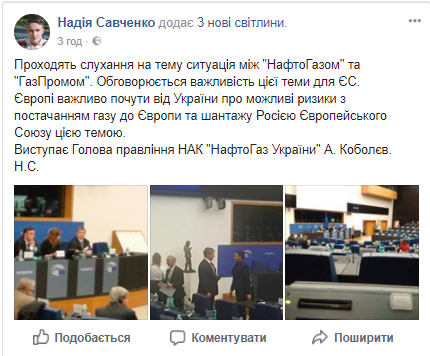 — Проходят слушания на тему ситуация между "Нафтогазом" и "Газпромом". Обсуждается важность этой темы для ЕС. Европе важно услышать от Украины о возможных рисках с поставками газа в Европу и шантаже Россией Европейского Союза этой темой. Выступает председатель правления НАК "Нафтогаз Украины" А. Коболев, - написала Савченко и опубликовала фотографии с заседания.