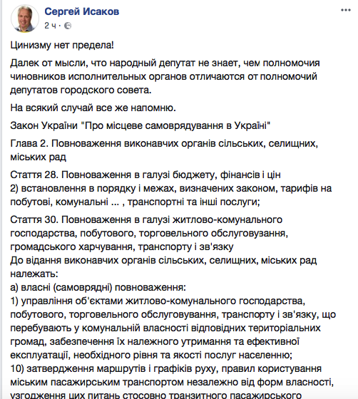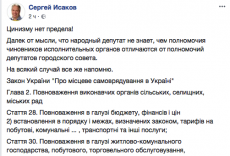 — Цинизму нет предела! Далек от мысли, что народный депутат не знает, чем полномочия чиновников исполнительных органов отличаются от полномочий депутатов городского совета, - написал Сергей Исаков.