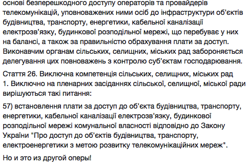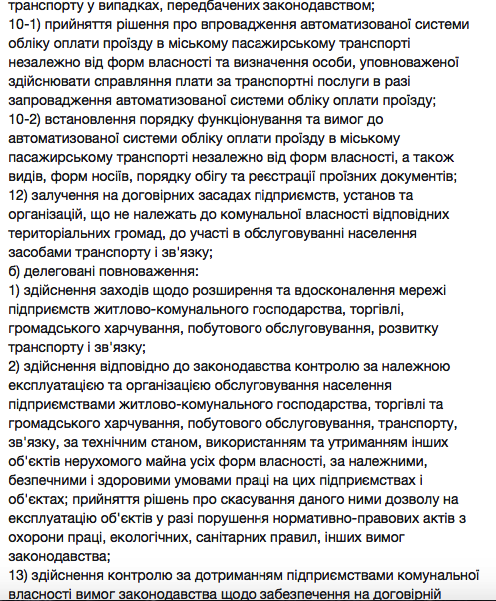 Далее депутат приводит в пример выдержки из Закона Украины «О местном самоуправлении», где перечислены все полномочия исполнительных органов. В одной из статей упоминается ведение вопроса общественного транспорта.