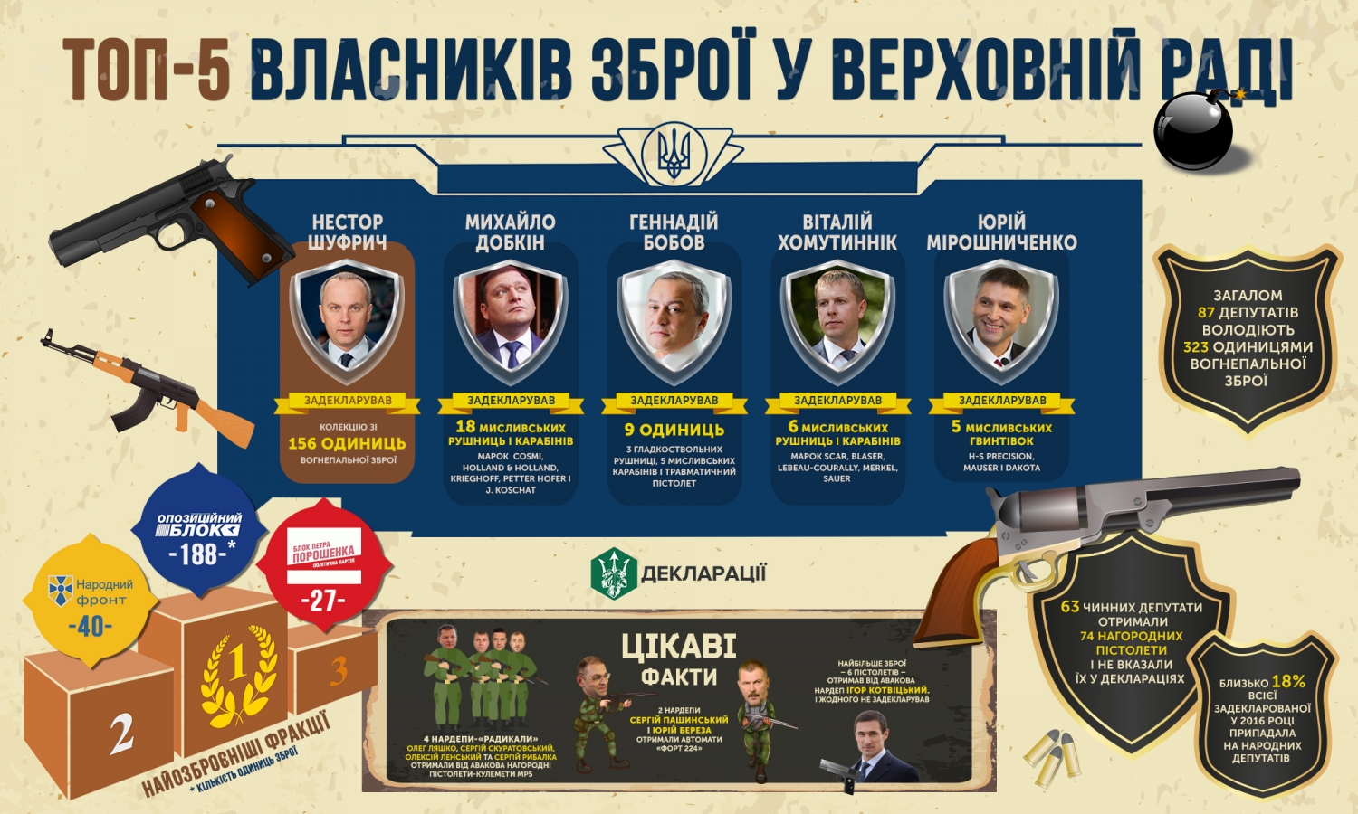 Согласно ежегодных деклараций за 2016 год, самым большим любителем оружия оказался Нестор Шуфрич, который указал коллекцию из 156 единиц огнестрельного оружия. На втором месте оказался его коллега-оппоблоковец Михаил Добкин.