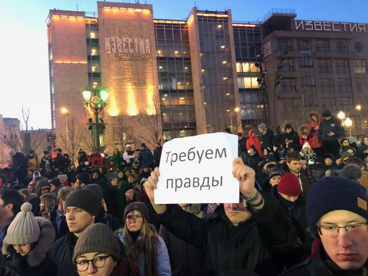 В Москве во время траурного митинга памяти жертв пожара в кемеровском торговом центре «Зимняя вишня» скандировали «Путина – в отставку», «Россия без Путина», «Кемерово, мы с тобой», «Правду! Правду!» и «Убийцам детей не место в Кремле».