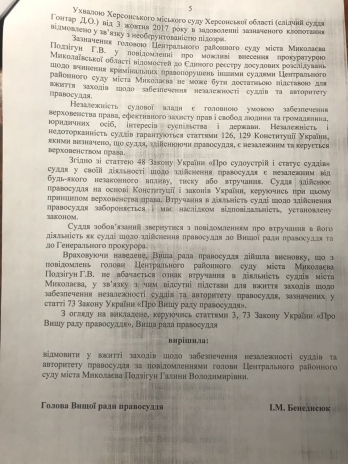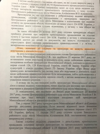 А глава Центрального районного суда Гадина Подзигун, в свою очередь, обратилась в Высший совет правосудия с просьбой применить меры к Прокуратуре Николаевской области касательно обеспечения независимости судей и авторитета правосудия. Глава Высшего совета правосудия Игорь Бенедисюк, рассмотрев обращение, отказал Галине Подзигун в каком-либо реагировании.
