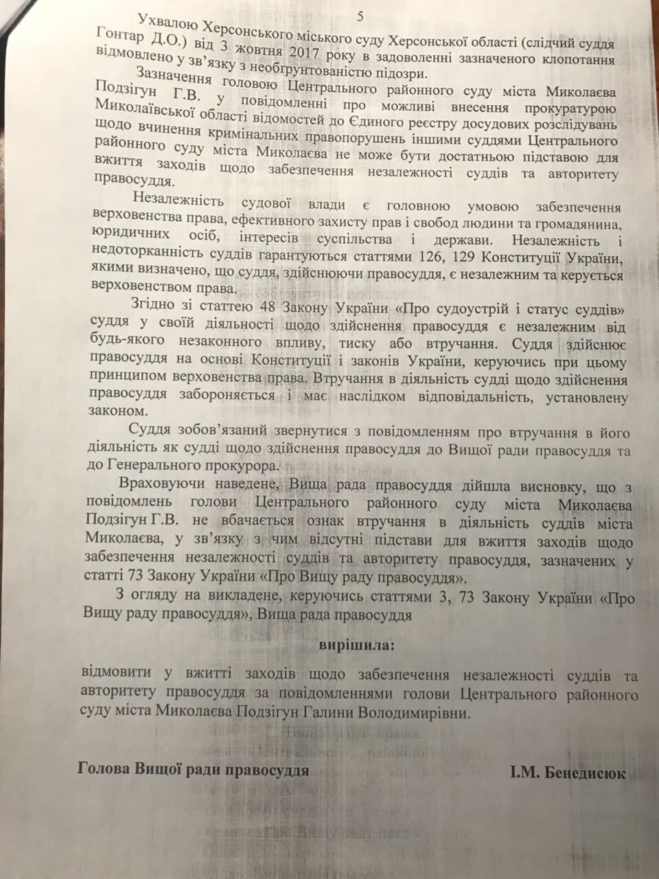 Глава Высшего совета правосудия Игорь Бенедисюк отказал главе Центрального районного суда Николаева Галине Подзигун в принятии мер относительно Прокуратуры Николаевской области, которую Подзигун обвиняла во вмешательстве в работу судей.