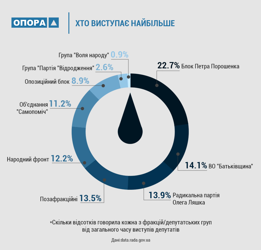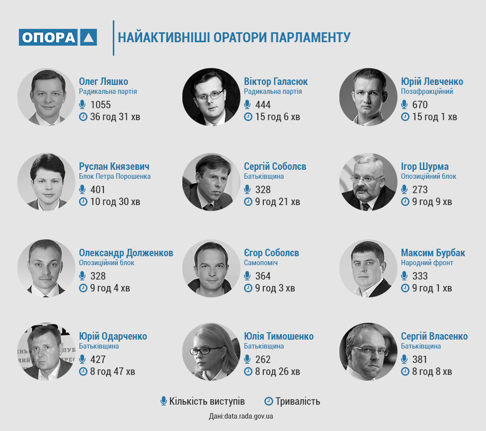 Чаще всего на заседаниях Верховной Рады выступали Олег Ляшко (глава фракции Радикальной партии), Виктор Галасюк (фракция РП), Юрий Левченко (внефракционный), Руслан Князевич (БПП) и Сергей Соболев (Батьківщина).