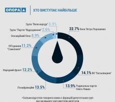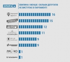 Зато, по информации ОПОРЫ, представители депутатских групп «Воля народа» и «Партия «Возрождение» практически не выступают в Раде.