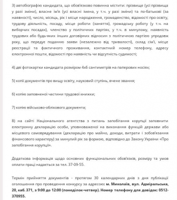 Исполнительный комитет Николаевского городского совета объявил конкурс на замещение вакантной должности начальника управления молодежной политики.