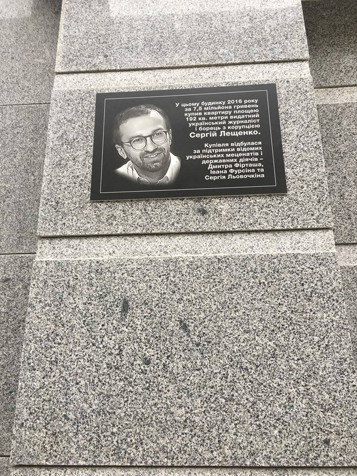 — В этом доме за 7,5 млн гривен купил квартиру площадью 192 кв. метров выдающийся украинский журналист и борец с коррупцией Сергей Лещенко, — пишется на табличке.