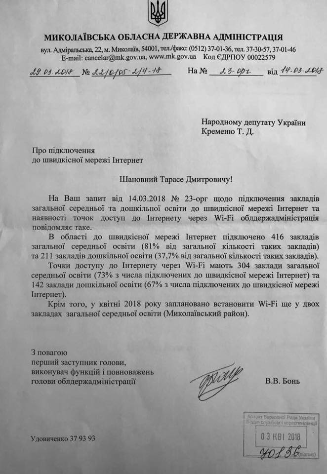 Об этом говорится в ответе первого заместителя главы Николаевской облгосадминистрации Вячеслава Боня на запрос народного депутата Тараса Креминя.