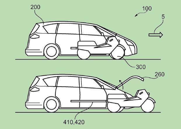 Как говорится в документе, новый транспорт объединит пассажирский автомобиль и мотоцикл, снабженный электромотором. При этом хотя бы часть приборной панели будет общей для двух транспортных средств.